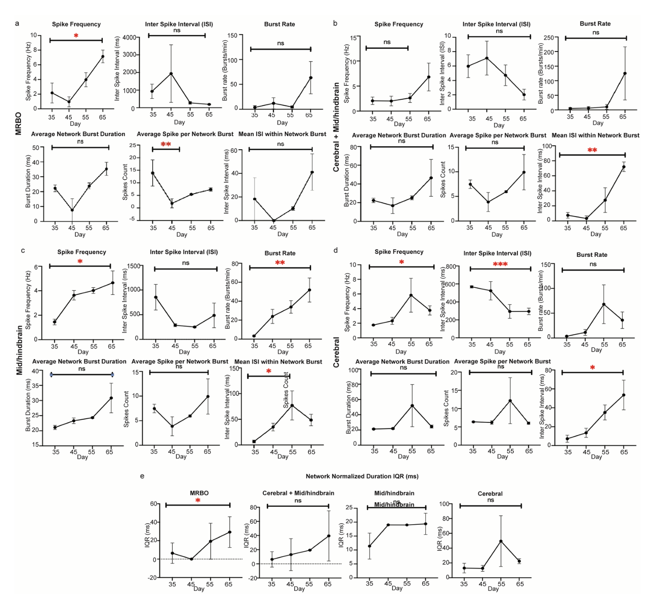 美国John Hopkins School of Medicine 图案最近发表的Multi-Region Brain Organoid –Fusion Organoid with Cerebral, Endothelial and MidHindbrain Components文章。 团队我们设计了多区域脑类器官 (MRBO),将大脑、中/后脑和复杂的内皮类器官整合到一个结构中。与早期基于分离的HUVEC的方法不同,我们的内皮类器官包含多种血管细胞类型,包括血管祖细胞、成熟内皮细胞、周细胞、增殖的血管生成细胞和基质细胞。单核RNA测序表明,MRBO会发育出特定于每个脑区的离散神经群,同时形成专门的内皮细胞群,这些内皮细胞群会建立旁分泌信号网络。与人胎脑数据的整合分析表明,MRBO贡献了人胎脑组织(卡内基12-16期)中80%的细胞簇,而CellChat分析则鉴定出13种此前未表征的内皮-神经信号相互作用。该MRBO系统为研究复杂的神经发育过程奠定了基础,提供了更接近生理相关性的有利环境。为了精确记录微弱信号,团队采用了MED64 Presto多道系统测量类器官自发电信号. [更多资讯,请关注进科驰安微信.]
