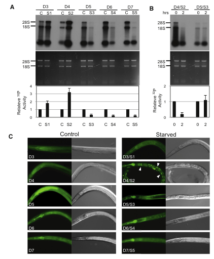 研究进一步揭示,饥饿初期线虫的核糖体生物合成和蛋白质周转率显著上升,这一过程依赖于 DAF-2胰岛素/IGF-1受体通过RAS通路(而非PI3K/AKT通路)的信号传导。此外,研究人员还通过该设备监测到,在脂肪储备耗尽后,线虫代谢活动转为抑制状态,以延长其生存时间。