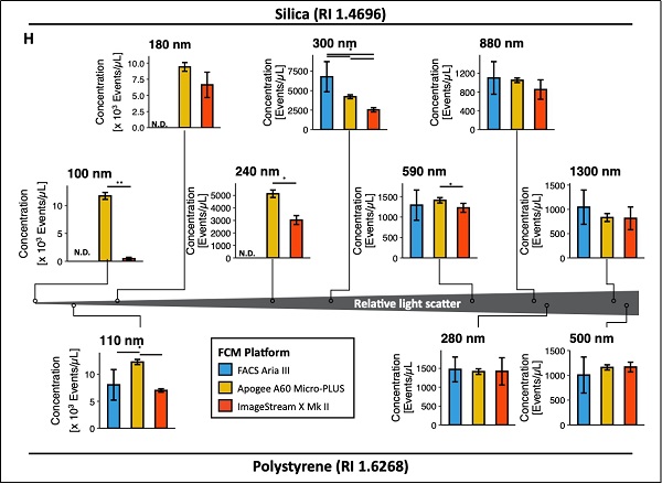“In line with observations for LoD and LoQ, Apogee A60 Micro-PLUS tended to be more sensitive in detecting small silica nanospheres, scattering very small amounts of light than all other platforms, followed by ImageStream X Mk II and, lastly, FACS Aria III. For larger silica nanospheres, all platforms performed similarly. Finally, results for fluorescent polystyrene nanospheres reflected those for silica nanospheres, where Apogee A60 Micro-PLUS performed better than other platforms in detecting small nanospheres”