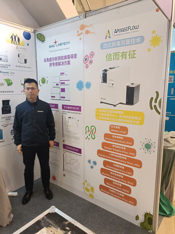 广州进科驰安科技(Bio-Gene)的分销商在展会现场设置专门的展位,并集中展示BMG LABTECH与Apogee两大品牌的科研产品:BMG LABTECH多功能酶标仪,支持多模式检测,可高效完成病毒中和试验等核心实验。Apogee流式细胞仪则以精准优势,为病毒颗粒分析提供可靠数据支撑。前来参观和咨询的参会者对这两个品牌的产品表示了极大的兴趣,很多老师在现场对仪器进行了详细咨询,并与我公司的销售和技术人员进行热烈的交流和讨论。这种互动不仅加深了参会者对产品的了解,也让Bio-Gene能够更直接地倾听用户需求,为产品的进一步优化、为科研与产业发展提供更优质的技术支持提供依据。