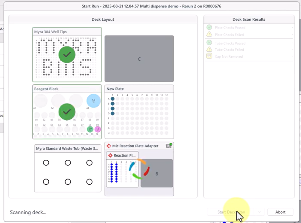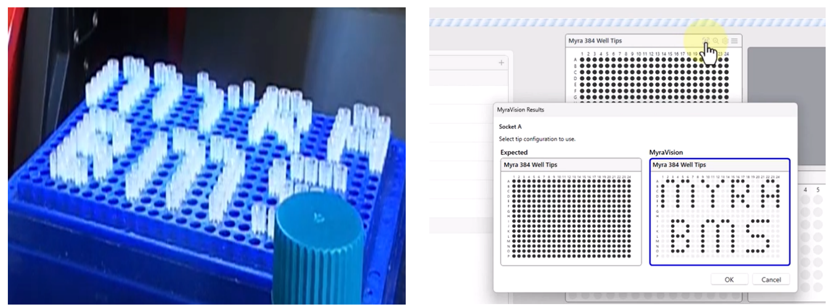MyraVision®:视觉识别与确认。利用计算机视觉技术理解工作台面布局,自动检测缺失的耗材(如枪头、板位),并确认实验设置是否正确(如试管盖是否打开)。用户只需一键扫描,即可轻松回答“我的枪头够吗?”“管子盖打开了吗?”“耗材放对了吗?”等关键问题,极大减少人为设置错误。Workbench 2.0的到来,标志着自动化实验正式迈入智能感知与自主决策的新纪元。